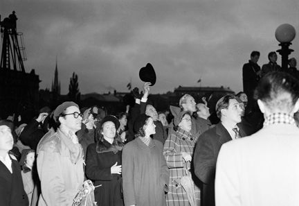 Människor på gatan hälsar den nye kungen Gustaf VI Adolf