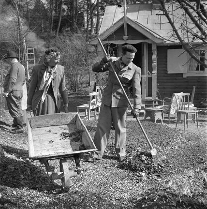 Vårstädning på droskägare Axel Grevillius (t.v.) koloniträdgård. Dottern Brita Nordin drar en skottkärra och hennes man Åke Nordin krattar löv.