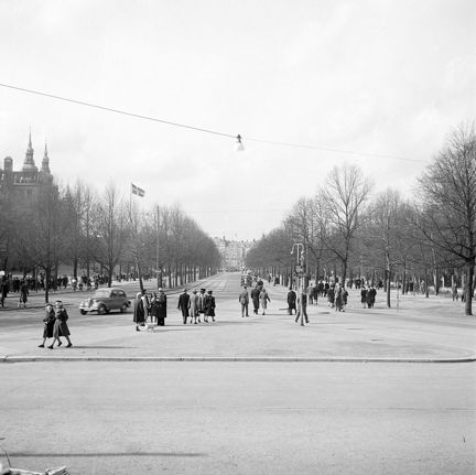 Djurgårdsvägen norrut. Lejonslätten t.h. och Nordiska Museet t.v