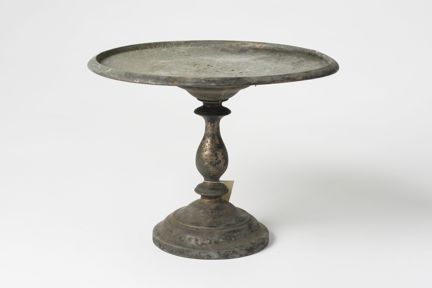 Tårtfat av bronserad vitmetall med en balusterformad, kraftig fot. På själva fatet är ”G. Siewertz” ingraverat.