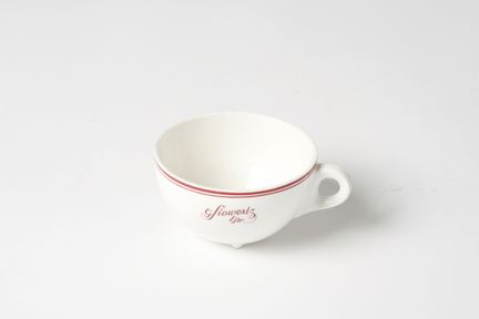 Kaffekopp från Siewertz konditori av vitt benporslin med dekor i form av röda ränder och text i rött: ”Siewertz Eftr”. Tillverkad av Gustafsbergs porslinsfabrik.