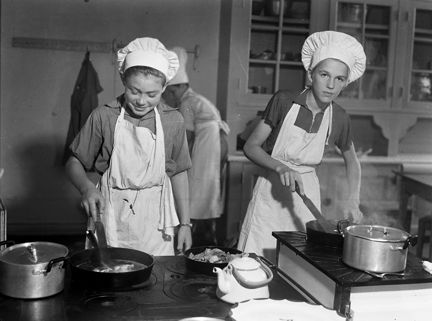 Folkskola på Lidingö. Pojkar lär sig laga mat, baka och hushållsskötsel. Porträtt av två pojkar i förkläden och kockmössa