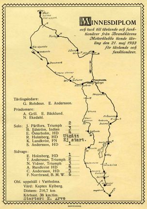 "Minnesdiplomen var en nyhet i all sin enkelhet, och de tilltalade alla. Ett aldrig så litet unikt minne, ett minne som endast de kunna få, som varit med om vår tionde tävling, det är ett minne av det slag man uppskattar. Heders för uppslaget! Man köper inte detta diplom i närmsta cigarraffär. Och inte inom sportens idrottsförlag heller. Hav tack!" sign Harley i Brandkårens IKs medlemsblad 1933. Sigurd Andersson i soloklassen och Erik Holmberg på motorcykel med sidovagn har erövrat första priset så många gånger att de nu får behålla vandringspriset för arv och ägo.