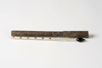 Sockerprovare, s.k. areometer, av glas med svart massa inuti spetsen. På undersidan står det "Aräometer für Zucker nach Baumé". Graderad 50-40-30-20-10-0. Till provaren hör ett fodral i två delar av (ursprungligen) lila papp. Tillverkad i Tyskland.