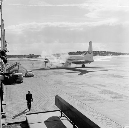 SAS-plan på Bromma flygplats startar motorerna med sedvanlig oljerök som följd. Till vänster lutar sig åskådare ut från terrass.