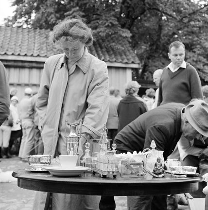 Auktion. Kvinna vid pelarbord med auktionsgods