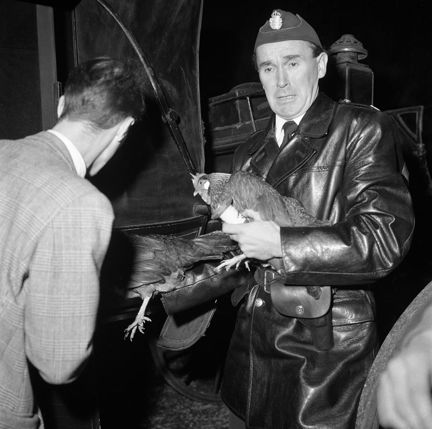 Kvarteret Getingen. Eldsvåda i kåkområdet. Sten Eriksson vid Radiopolisen räddar några hönor