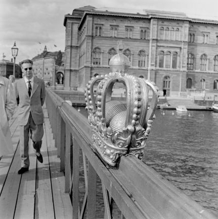 Nationalmuseum sett från Skeppsholmsbron. I förgrunden broräcket med förgylld kunglig krona