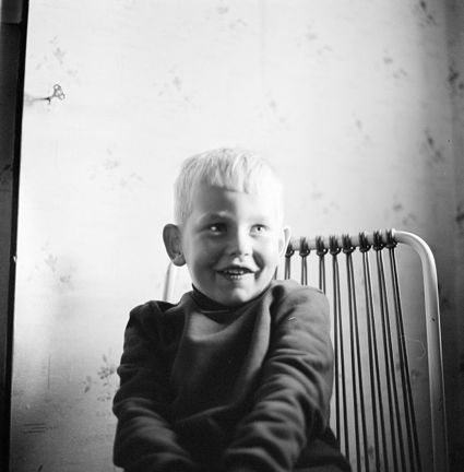 Porträtt av liten pojke, Thomas Risberg, i stol mot bakgrund av blommig tapet. Rävsnäs.