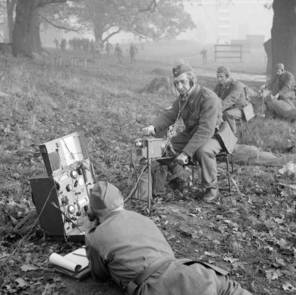 Svea Artilleriregemente. Radioövning utomhus. I bakgrunden hinderbana