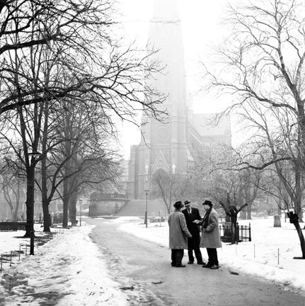Johannes kyrkogård med Johannes kyrka, från väster. Tre män i förgrunden