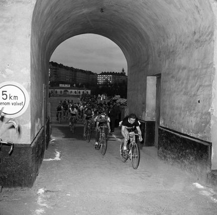 Karlbergs slott. Karlbergsloppet. Cyklister cyklar genom ett valv