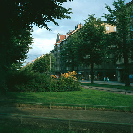 Karlavägen österut från korsningen av Sturegatan. Plantering med liljor