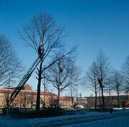 Parkarbetare uppe i träden i Valhallavägens allé arbetar med beskärning. I bakgrunden Gärdesskolan