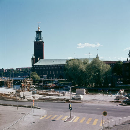 Stadshuset sett från Klarabergsviadukten. I förgrunden Blekholmsgatan, Klara Strand och bygget av Klarastrandsleden