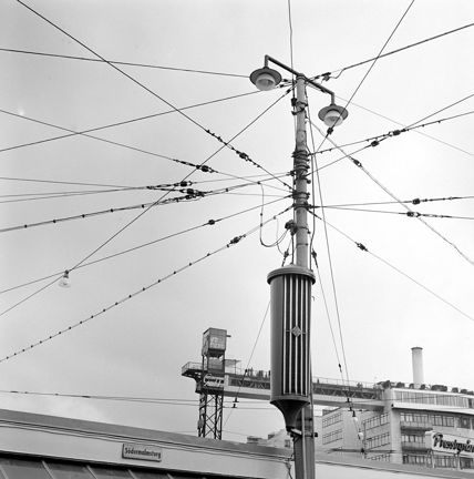 Stolpe för spårvägens luftledningar vid Slussen. I bakgrunden Katarinahissen