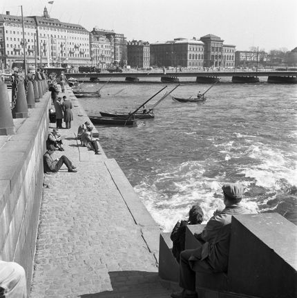 Fiskebåtar i Norrström och folkliv på kajen vid Strömgatan, vy mot Blasieholmen