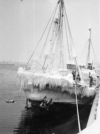 Holländsk båt täckt av snö och is