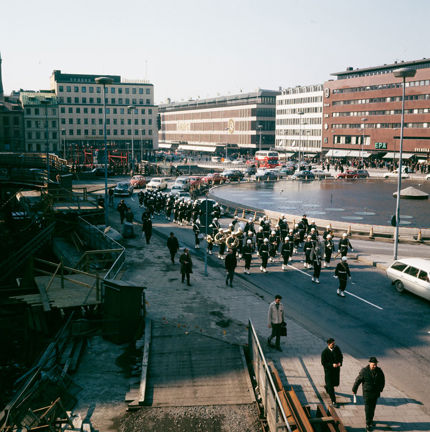 Vaktparaden i rondellen vid Sergels Torg. Vy från Malmskillnadsgatan mot Klarabergsgatan