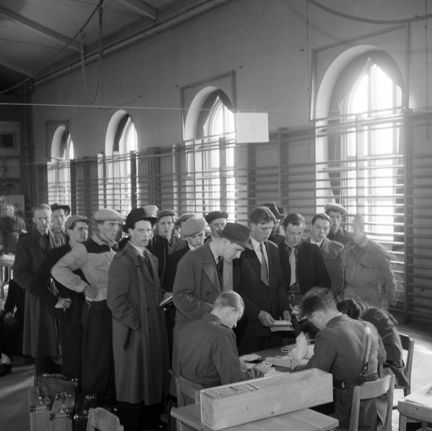Svea Artilleriregemente. Inmönstring. En stor grupp unga män väntar på sin tur framför ett skrivbord