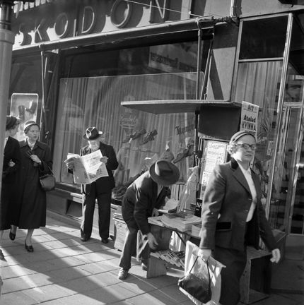 Drottninggatan 65. Tidningsförsäljning utanför Kembels skor