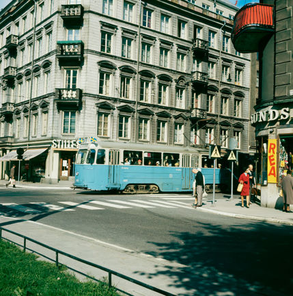 Från Karlavägsallén mot kv. Ekorren. Spårvagn 8 på väg söderut på Sibyllegatan. Det är Spårvagnens dag, dagen innan högertrafikomläggningen