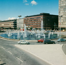 Fotografiet är taget av Ingemar Gram i november 1967. Fontänen är under uppbyggnad men de gamla husen är fortfarande kvar där Kulturhuset kommer att byggas ett par år senare.