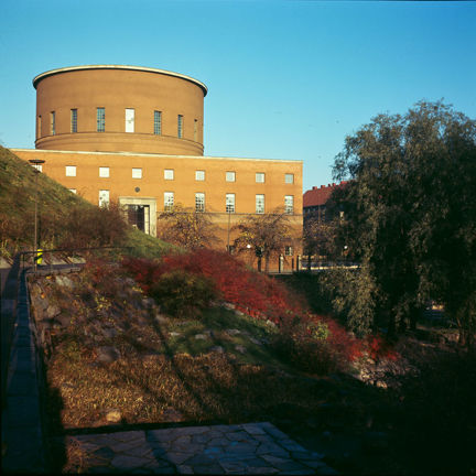Oxbärsbuskar vid Bäckfåran i Observatorielunden. Vy mot Stadsbibliotekets södra fasad