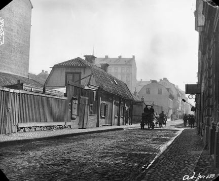 Luntmakargatan söderut. T.v. Luntmakargatan 54 (nuv. 80) vid hörnet av Rehnsgatan. I huset låg N. A. Hedjersons glasmästeri och ramaffär