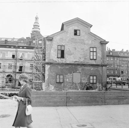 Stockholms stadsmuseum. Byggnadsställningar på norra flygelns fasad mot gården