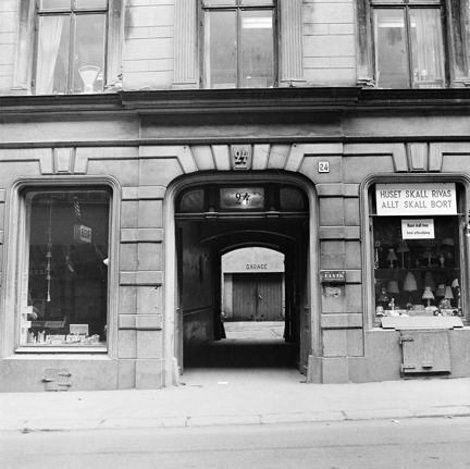 Herkulesgatan 24 innan rivning. Inkörsporten i mittaxeln. Garage och lampaffär