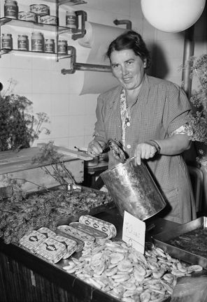 Kvinna säljer kräftor inför premiären. Även räkor, majonäs och ansjovis finns i butiken