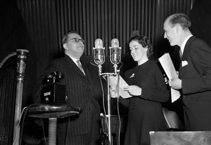 Karlaplan 4, Karlaplansstudion/Radiotjänst. Radioprogrammet Karusellen. Till höger Lennart Hyland, till vänster författaren Gösta Knutsson. Mellan dem en okänd kvinna med manus i handen