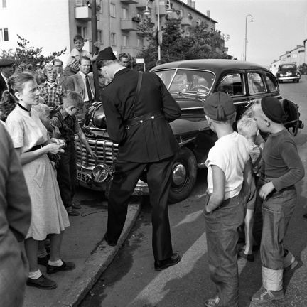 Hägerstensåsen. Folksamling kring en bil som krockat