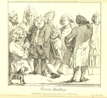 "Detta skämt med några Stockholmsoriginaler mot slutet af 1740-talet graverades på Carl Gustaf Tessins föranstaltande af sed. hofintendenten Jean E. Rehn (f. 1717 d. 1793) omkring 1750; den satiriske grefven har tillegnat den "lyckliga samlingen" tvänne sina medbröder i rådet, excellenserne Ekeblad och Höpken, båda storheter af första rang. [...]