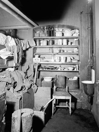 Dalkarlshärbärge vid Sergelgatan 10, nb. Kökshyllor, tvättlina och handfat