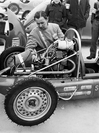 Flatenloppet. En man mekar med motorn i en Cooper-Norton 500 cc 1953
