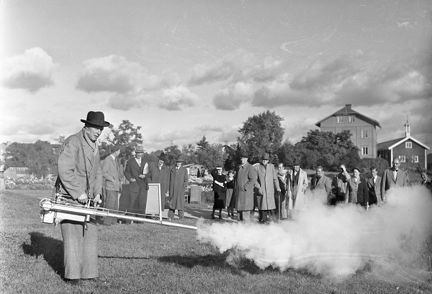 Experimentalfältet. Lantbruksakademien och Svenska Dagbladets expo, ""Trädgården i dag"". Trädgårdsdirektör Sven Gréen demonstrerar sprutan som håller nattfrosten i schack