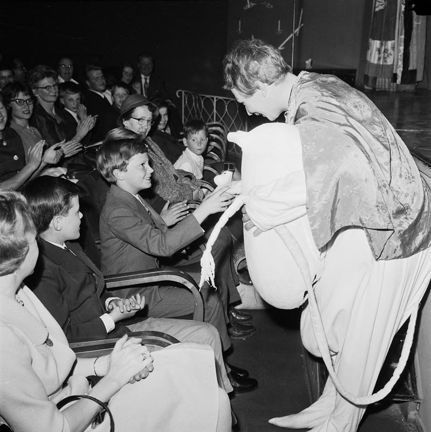 Kronprins Carl Gustaf tittar på föreställning med Mumintrollet