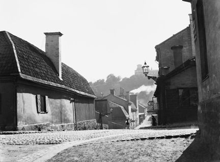 Rehnsgatan västerut från Döbelnsgatan. T. v. Döbelnsgatan 57. I fonden skymtar Observatoriet i Observatorielunden