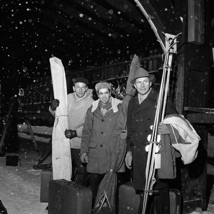 Centralstationen. Skidtrupp anländer bestående av Gunnar Samuelsson, Sture Larsson och Mora-Nisse