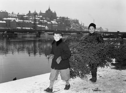 Munkbroleden/Kornhamn, kajkanten, vy mot sydväst. Pojkarna Hans Hertsjö och Lars Jansson bär en julgran från försäljningen på Kornhamnstorg