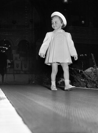 En flicka i kappa och hatt på catwalken under Röda korsets barnmannekänguppvisning