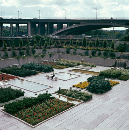 Folksam; planteringar, dammar och vattenfall i gårdsparken söder om höghuset. Vy mot Skanstullsbron