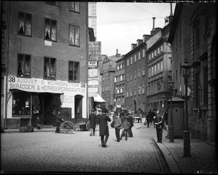 Österlånggatan norrut från Järntorget. Till höger vakt utanför Gamla Riksbanken