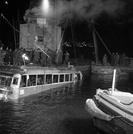 Sundet mellan Lilla- och Stora Essingen. Buss på linje 96 bärgas efter olyckan på Stora Essingebron. (Krock med lastbil. Bussen störtade genom broräcket. 11 personer omkommer och 1 överlever)