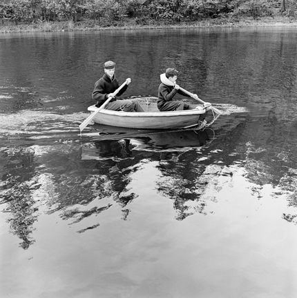 Bengt Eckerrot och Mats Lindgren och paddlar en liten jolle. Mats Lindgren har en flytring runt halsen