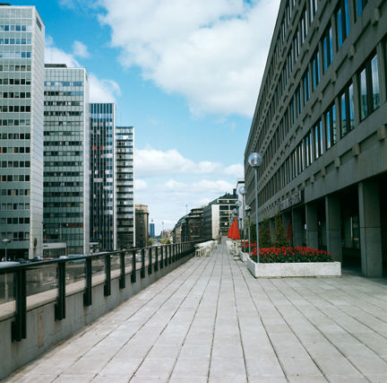 Planteringar och cafémöbler på Stockholmsterrassen. Vy norrut. Till vänster de fyra första hötorgshusen