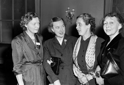 Brunkebergstorg 13-15, Gillet. Sociala och politiska diskussionsklubben i Stockholm, har bjudit in till diskussion, ""Kvinnan som samhällsmedlem"". Fr. v. V. Adlers, L. Olsson och E. Adlercreutz