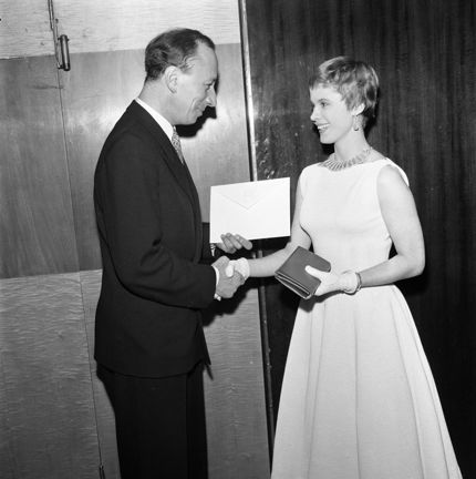 Drottninggatan 82, Skandia Biografen. Skådespelerskan Bibi Andersson mottager Daniel Engdahls stipendium på 2000 kr av Gunnar Sjöberg i samband med premiären av ""Sommarnöje sökes""